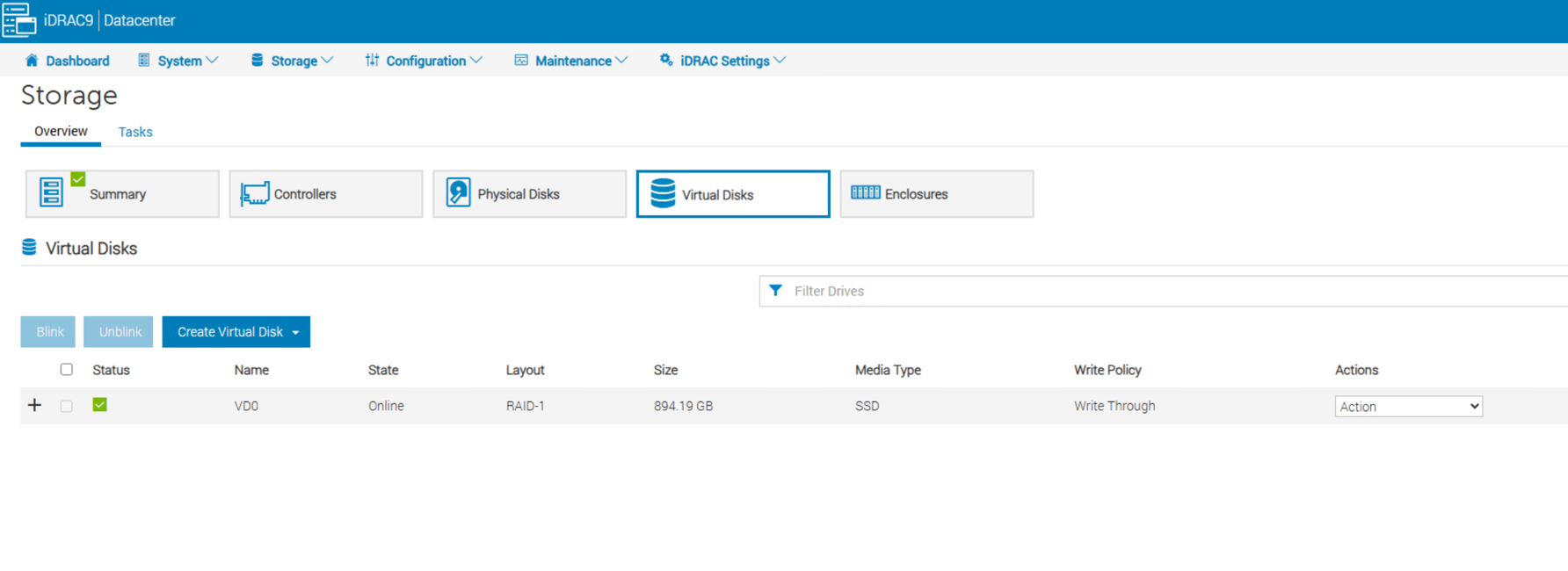 - Navigate to Storage > Overview > Virtual Disks and verify a virtual disk is present.